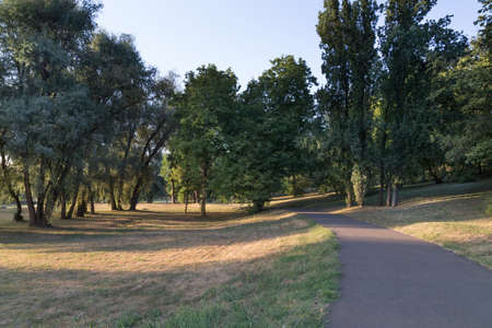 Asphalt path for walking in the city park. A beautiful summer landscape filled and the blue sky.