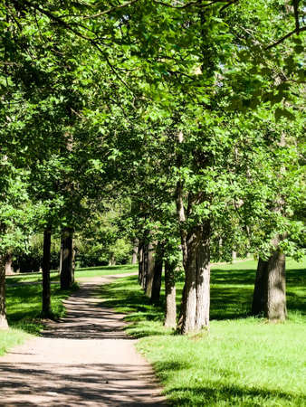 Green city park with walking paths, trail next to a green hedge, cloudy day, Gatchina garden, Saint Petersburg, Russia