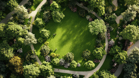 Discover an aerial view of a beautifully designed park showcasing symmetry and lush greenery, inviting visitors to enjoy nature and tranquility.