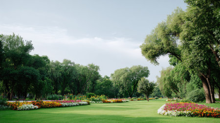 A public park with bright green grass, tree-lined paths, and flowers, offering a perfect space for overlay text or graphic design in the center