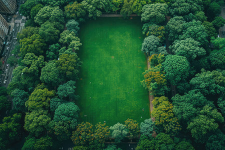 An aerial view showcasing a lush green park surrounded by vibrant trees and serene water bodies. This landscape captures the beauty of nature and tranquility.