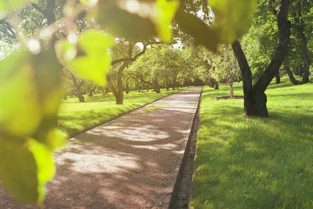 Green park with walkway and trees in sunny summer day. Nature background