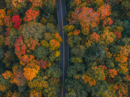 An aerial view captures a tranquil autumn scene with vibrant foliage and a winding road. The colors of fall create a stunning natural landscape perfect for outdoor enthusiasts.