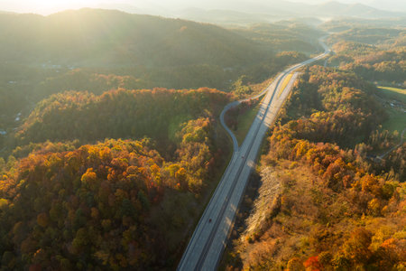 Aerial view of I-40 freeway in North Carolina heading to Asheville through Appalachian mountains in golden fall with moving trucks and cars. Interstate transportation concept