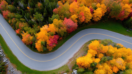 Experience the stunning beauty of fall with this aerial shot of a winding road embraced by vibrant autumn trees, showcasing a rich palette of nature's colors.