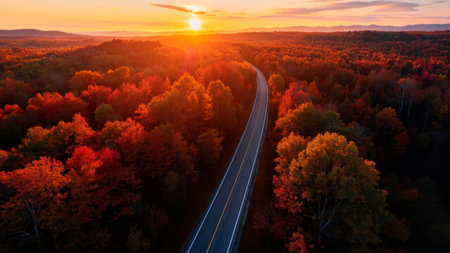 A scenic aerial perspective showcases a road meandering through a landscape ablaze with the warm colors of fall.