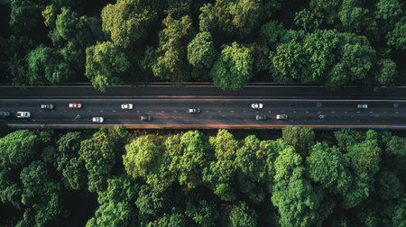 An overhead view captures a highway bisecting a vibrant green forest. The image displays a symmetrical composition with the road lined with vehicles. The lush tree canopy creates a textured surface, and the scene is likely captured during daylight. The image is suitable for diverse commercial applications.