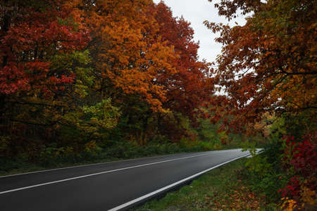 Scenic road curves through autumn trees in foggy weather during early morning hours