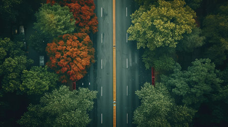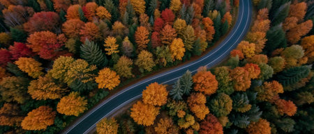 aerial view of winding road surrounded by vibrant autumn trees, created with generative ai
