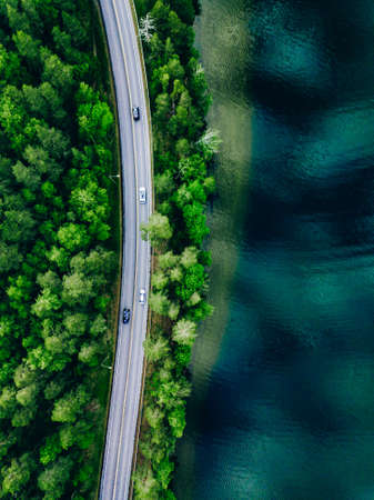Aerial view of coastline road with green woods and blue lakes water in summer Finland.