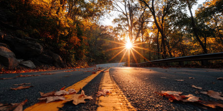 A stunning autumn landscape featuring a winding road surrounded by vibrant foliage, with sunlight creating a picturesque ambiance perfect for nature lovers.