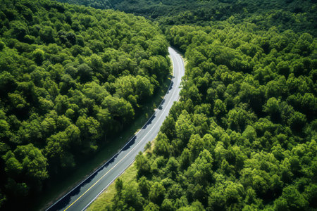 This scenic aerial view captures a grey asphalt highway as it gracefully curves through rolling hills covered in lush green forests. The dense foliage of trees stretches as far as the eye can creating a vibrant natural landscape. The road appears as a ribbon cutting through the wilderness, inviting a sense of journey and exploration. The sky above is partly cloudy, with warm light suggesting either early morning or late afternoon, casting a serene and peaceful atmosphere over the expansive...