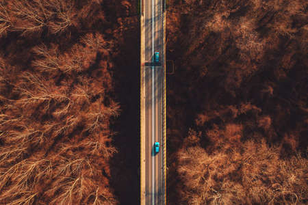Aerial view of two cars driving down the road through deciduous forest, top view drone photography