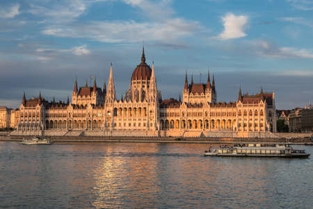 Evening sun on the facade of the Parliament building across Danube river, Budapest, Hungary.
