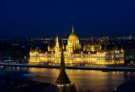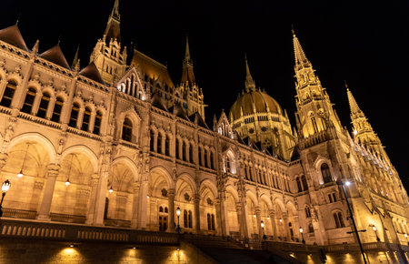 The Hungarian Parliament in Budapest on the Danube in the night lights of the street lamps
