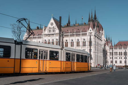 Tram pass by Hungarian Parliament in winter