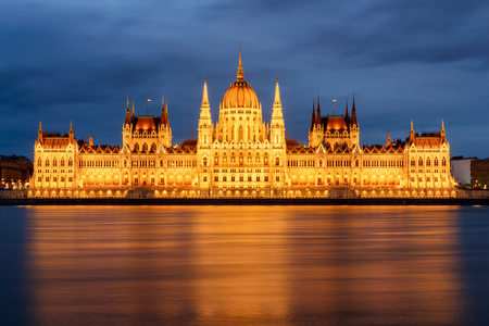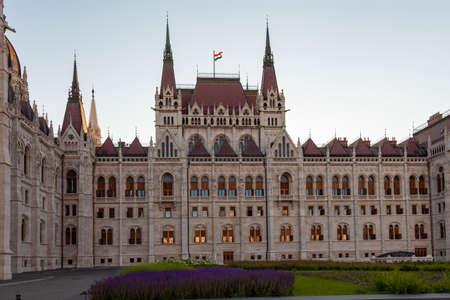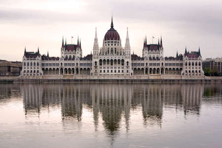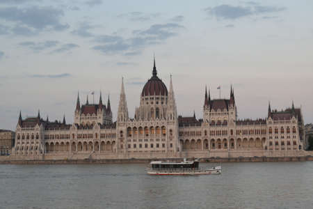 The Hungarian Parliament Building on the bank of the Danube in Budapest at evening
