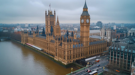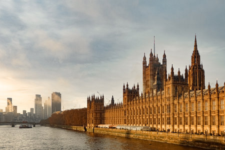 Palace of Westminster and river Thames with historic architecture and contemporary city buildings under a warm, cloudy sky