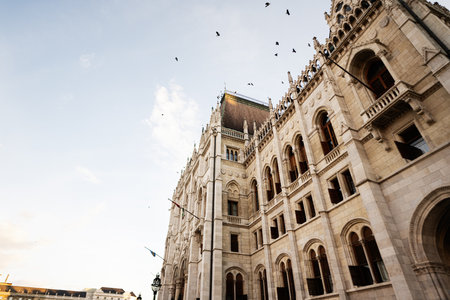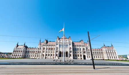 Budapest, Hungary - April 20, 2020: Building of the Hungarian Parliament Orszaghaz at the Kossuth square. The seat of the National Assembly of Hungary.