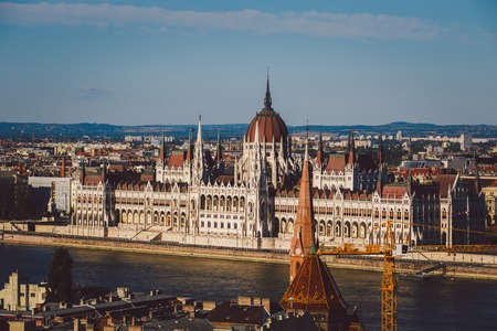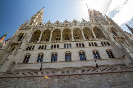 Evening sun on the facade of the Parliament building across Danube river, Budapest, Hungary.
