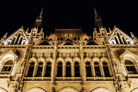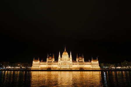 The Hungarian Parliament in Budapest on the Danube in the night lights of the street lamps