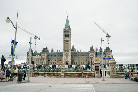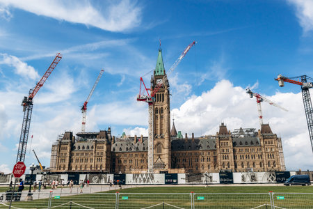 Ottawa, Canada - August 13, 2025: View of the Centre Block and Peace Tower under renovation on Parliament Hill