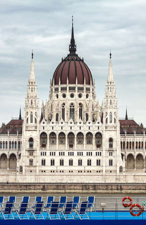 Parliament building in Budapest over blue chairs, Hungary, front view, closeup