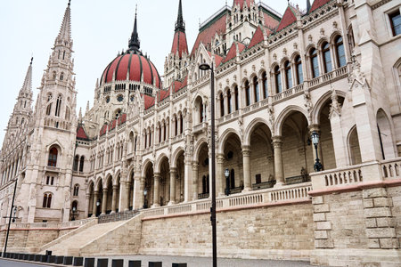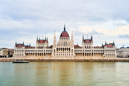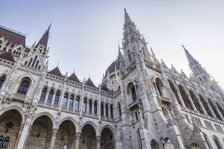 Hungarian Parliament gothic facade, amazing building on Danube river bank in Budapest
