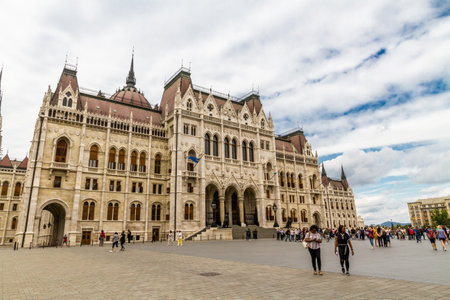 Budapest, Steps of the Hungarian Parliament Building with tourists, wide angle, landscape, on September 17 2019 in Hungary