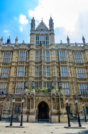 Westminster Palace, London. Old Palace Yard facade detail, with sun lighting and blue sky background.