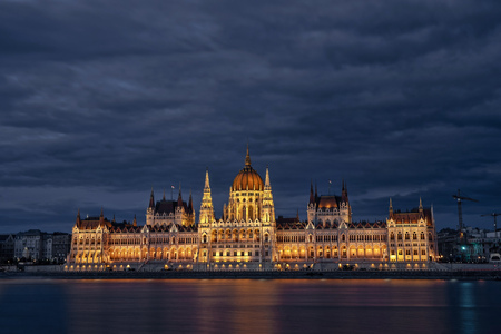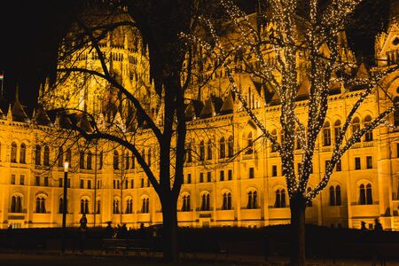 The Hungarian Parliament in Budapest on the Danube in the night lights of the street lamps