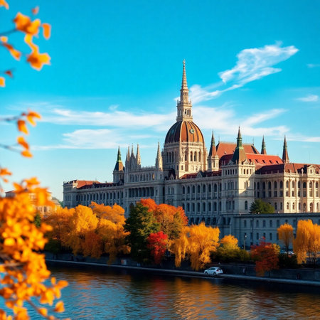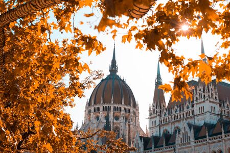 Old European Parliament Building in Budapest on a background of yellow autumn foliage