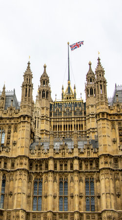Great Britain flag on top of the Palace of Westminster known as Houses of Parliament, London, UK