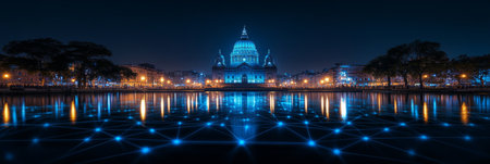 Downtown Cityscape By River, Digital Network Pattern Over Historic Monument Illuminated In Blue.