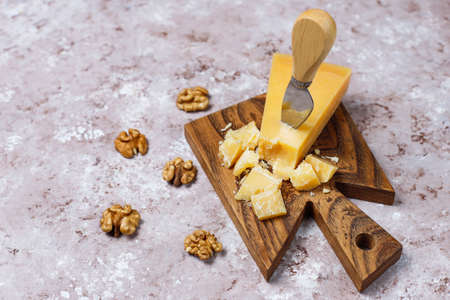 Cheese collection, piece of matured cheese pasmesan parmigiano reggiano and Italian houses made from cow milk