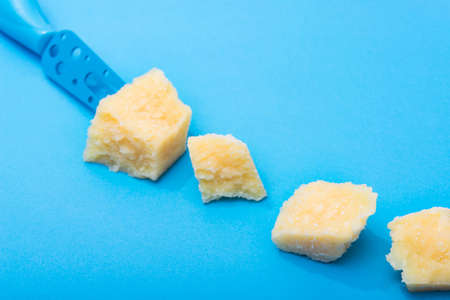Tasty parmesan yellow cheese pieces on a blue background. Color and minimal concept.