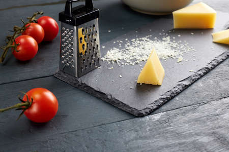 Piece and grated parmesan cheese on black serving board on wooden table with cherry tomatoes. Grated parmesan for sprinkling on salad.