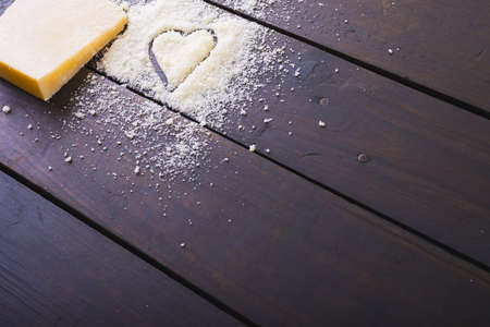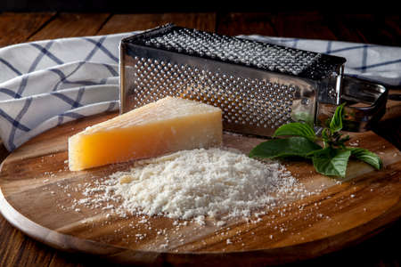 Grated Parmesan Cheese on a wooden cutting board. Dark rustic style.