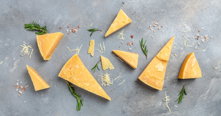 Parmesan cheese, Hard cheese, rosemary on a light background. Long banner format. top view.