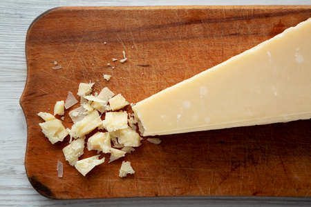 A Piece of Parmigiano Reggiano on a rustic wooden board on a white wooden background, top view. Flat lay, overhead, from above.