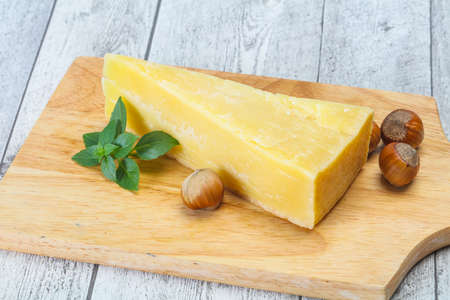 Big wedge of parmigiano-reggiano parmesan hard Italian cheese made from cow milk or Grana Padano close up