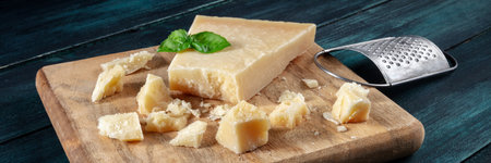 Parmesan cheese panorama with fresh basil leaves and a vintage grater on a dark blue wooden background