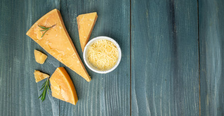 Parmesan cheese, Hard cheese, rosemary on a light background. Long banner format. top view.