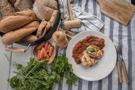 cooking healthy diet food in the home kitchen, Healthy Chicken parmesan with spices in baking dish on table
