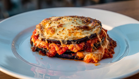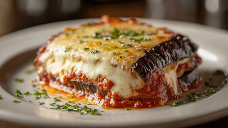 Enjoy a beautiful serving of rustic melanzane alla parmigiana, featuring baked layers of eggplant, rich tomato sauce, and melted cheese on a elegant plate.
