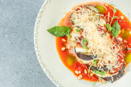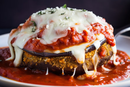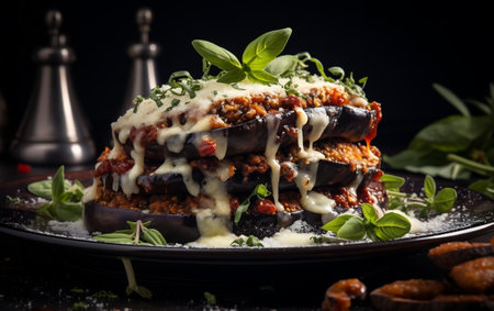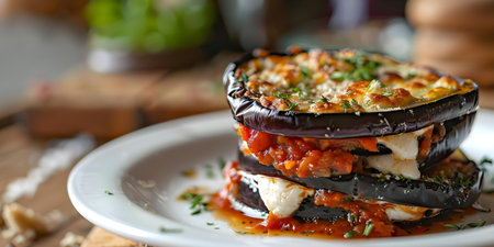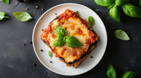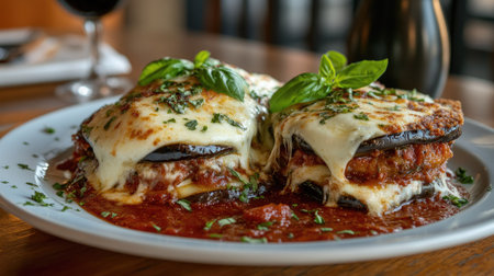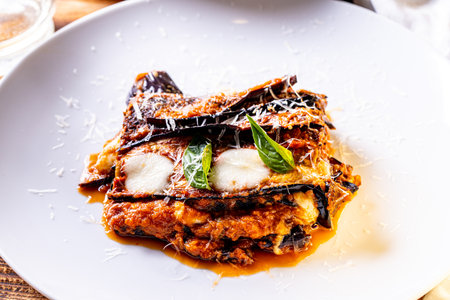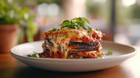 A delicious serving of melanzane alla parmigiana on a stylish plate, boasting layers of eggplant, cheese, and basil, perfect for any Italian meal.