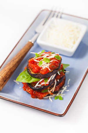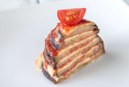 Layered Italian Eggplant Appetizer on White Background. Selective focus.