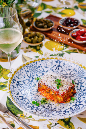 lasagna with and glass of white wine