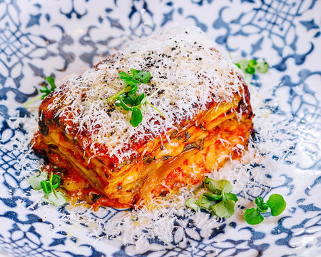 A beautifully presented serving of layered pasta topped with rich cheese and herbs. Perfect for showcasing culinary delights in food photography.