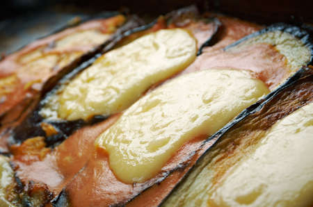 Italian cuisine: delicious macro Melanzane alla parmigiana in a baking dish. Background for using the menu. High quality photo